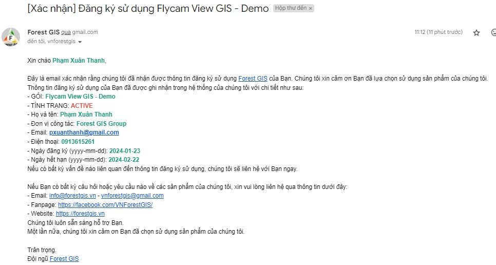 Nếu thực hiện đăng ký sử dụng Flycam View GIS thành công, sẽ có 1 email tự động thông báo gởi đến Bạn với nội dung tương tự như hình: