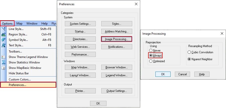 LƯU Ý: Trước khi sử dụng tool Flycam View GIS cần chọn trên menu của Mapinfo: Options -> References… -> Image Processing… -> Always như hình dưới đây: