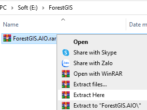 - Click chuột phải vào tập tin ForestGIS.AIO.rar, chọn Extract Here (với máy đã cài đặt WinRAR)