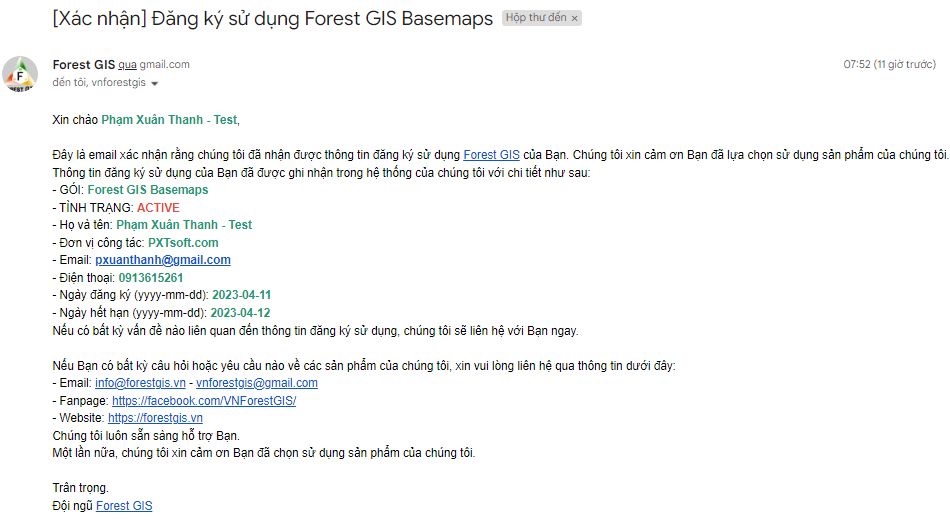 Nếu thực hiện đăng ký sử dụng Forest GIS thành công, sẽ có 1 email tự động thông báo gởi đến Bạn với nội dung tương tự như hình: